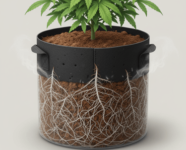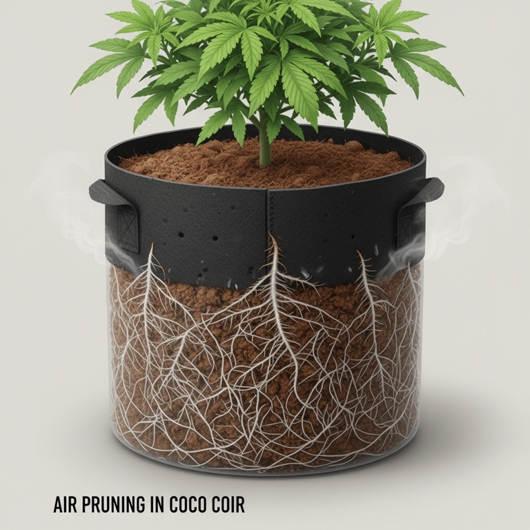 When you combine the sponge-like qualities of coco coir with the fabric pots shown in our diagram, you unlock a powerful biological process known as Air Pruning. Unlike traditional plastic pots where roots hit a hard wall and begin to spiral into a "root-bound" knot (suffocation), fabric pots allow the root zone to breathe.