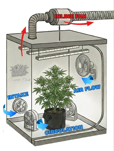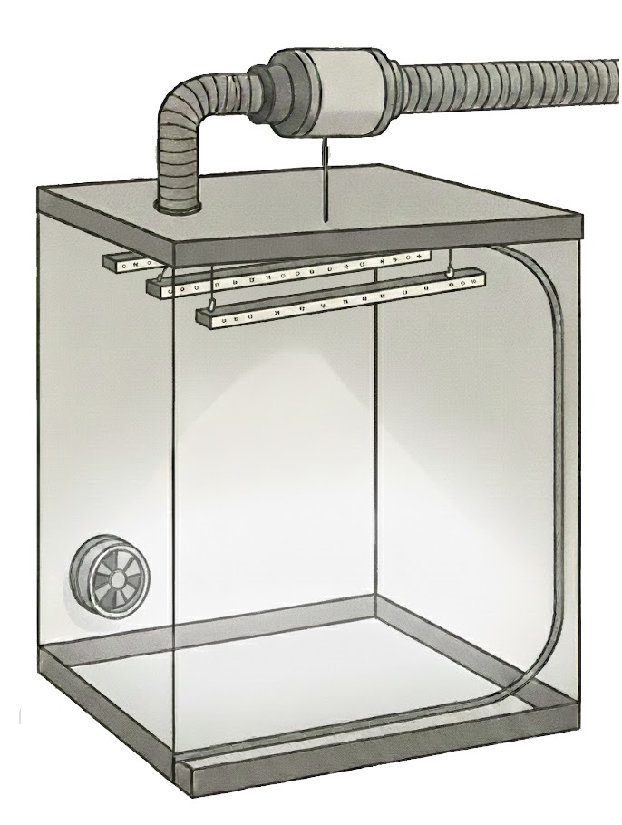 Ensure the bottom mesh vents or "passive intake" ports are open (as seen on the bottom left of the diagram). This allows fresh, cool air to be sucked in as the top fan pulls old air out. It is recommended to designate a lung room or a inlet for fresh air. Attach ducting to your intake port and run it to this area. it can be as simple as a hallway or den where people sit and talk. If using a wind be sure to filter the air at both ends of you ducting to avoid pests and pathogens.