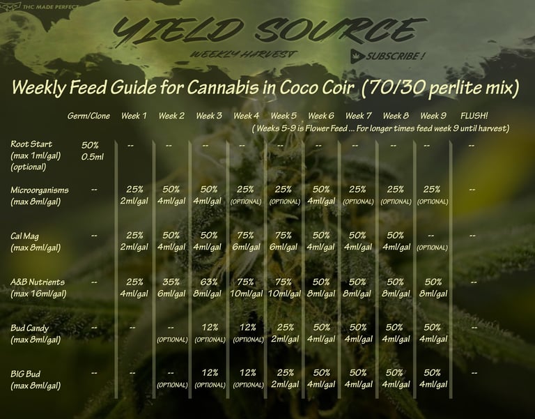 This feed chart provides a precise nutrient schedule optimized for hydroponic and coco coir growing. If you're using soil as your medium, you can still benefit from this chart with a simple adjustment.
